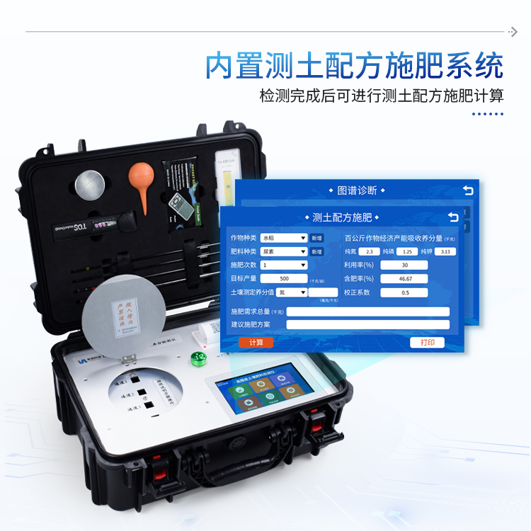 17.内置测土配方施肥系统,检测完成后可直接进行测土配方施肥计算;同时具有单独配方施肥计算模块;仪器内置百余种常见经济作物标准养分值,内置施肥校正系数,可对目标产量计算施肥量,以此指导农业生产;测土配方施肥结果可打印,打印内容包含作物种类、肥料种类、目标产量、需求总量、建议施肥方案。