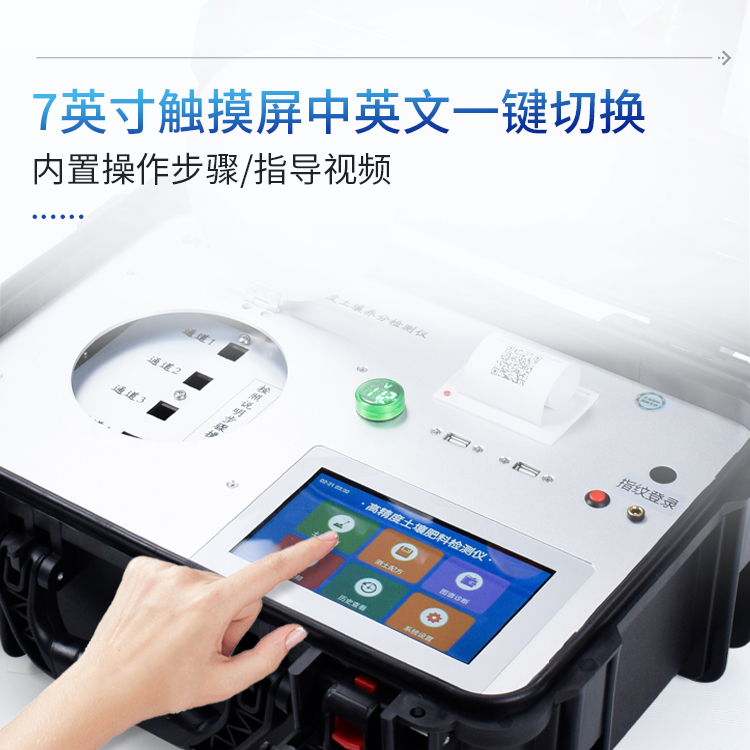 7.数据打印:内置热敏打印机(无需更换色带),可打印出检测项目、检测单位、检测人员、检测时间、通道号、吸光度、养分含量、以及二维码等信息。