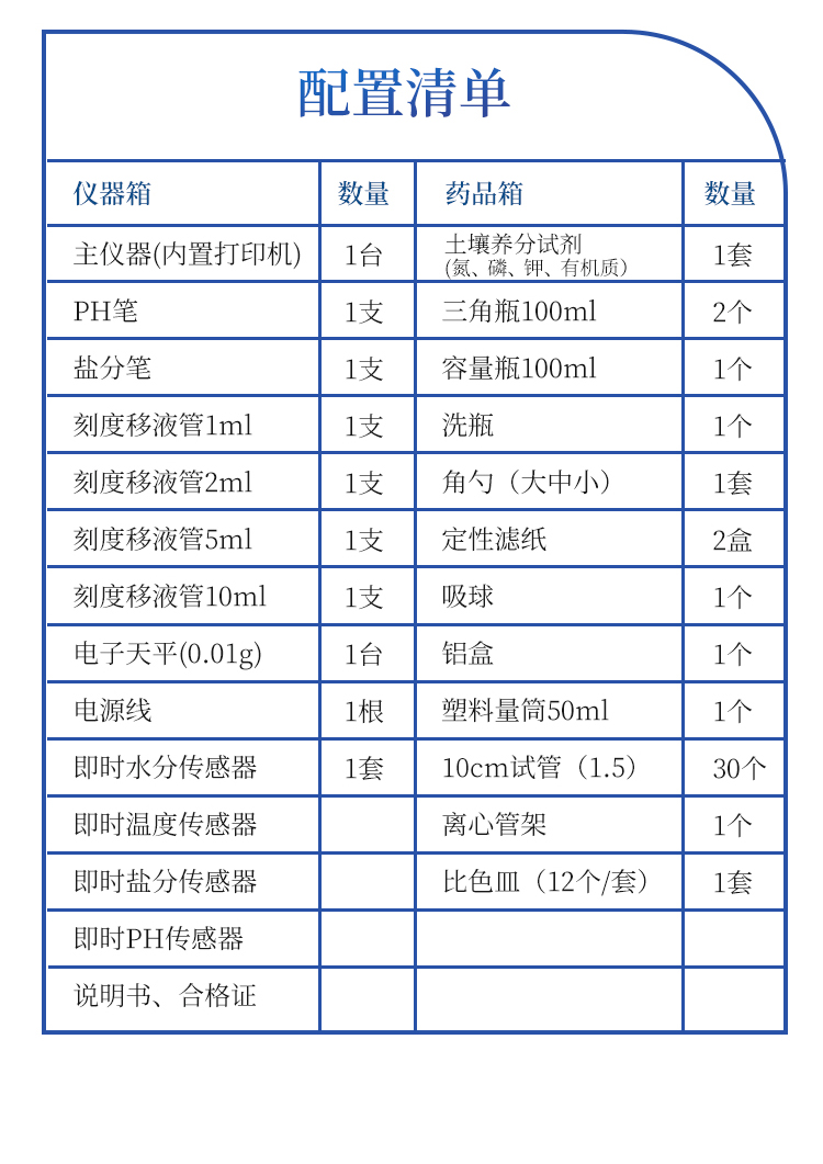 1 | 主仪器(内置打印机) | 1台 | 1 | 土壤养分试剂 (氮、磷、钾、有机质) | 1套 |