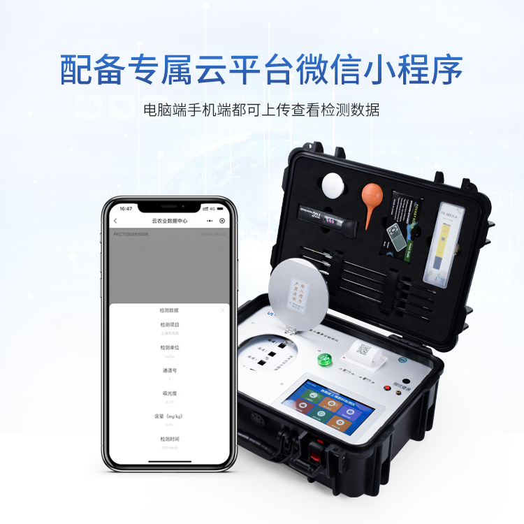 7.数据打印:内置热敏打印机(无需更换色带),可打印出检测项目、检测单位、检测人员、检测时间、通道号、吸光度、养分含量(mg/kg)、以及二维码等信息。
