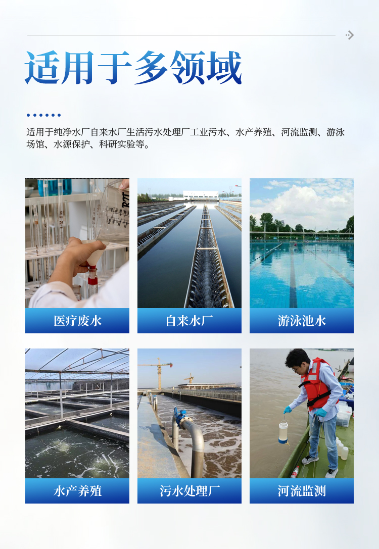 能够广泛应用于食品厂、医院、污水处理、饲养中心、水产养殖、消毒化粪池等有效氯浓度检测;也适用于漂白粉、漂粉精片及一些类似的消毒剂中有效氯含量的测定,以便制备合格的消毒水达到国家规定的消毒标准。