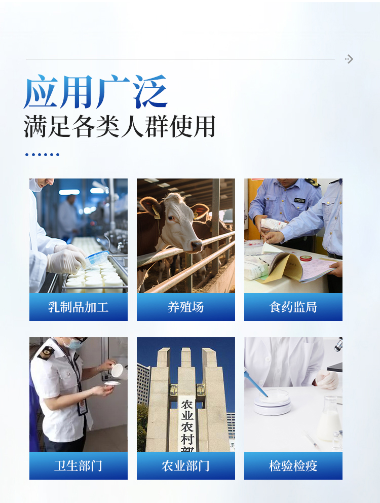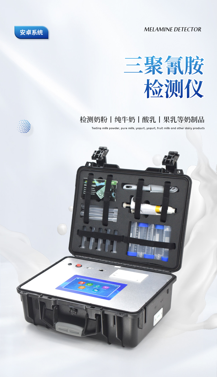 三聚氰胺检测仪可快速定量分析检测奶粉、纯牛奶、酸乳、果乳等奶制品、其它食品以及饲料中的三聚氰胺含量。从原料采购到成品检验均可使用,三聚氰胺检测仪广泛应用于乳制品加工、养殖场、食药监局、卫生部门、农业部门、检验检疫等部门使用。