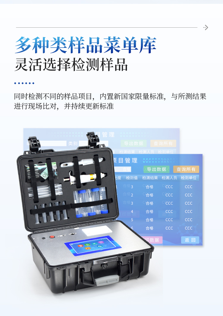 5、一体化便携式快检设备,满足现场及流动检测使用需求,能够在同一软件下实现所有检测项目的检测,并可通过同一窗口直观显示检测结果。