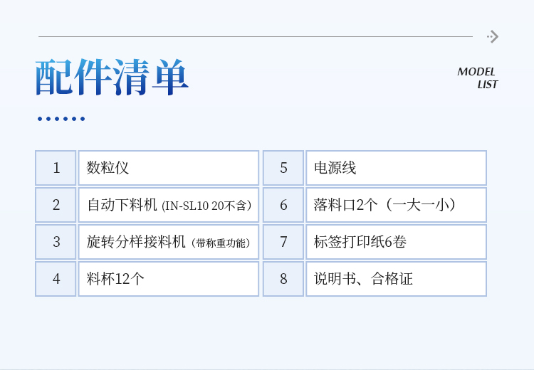数粒仪、旋转分样接料机(带称重功能)、料杯12个、电源线、落料口2个(一大一小)、标签打印纸6卷、说明书、合格证