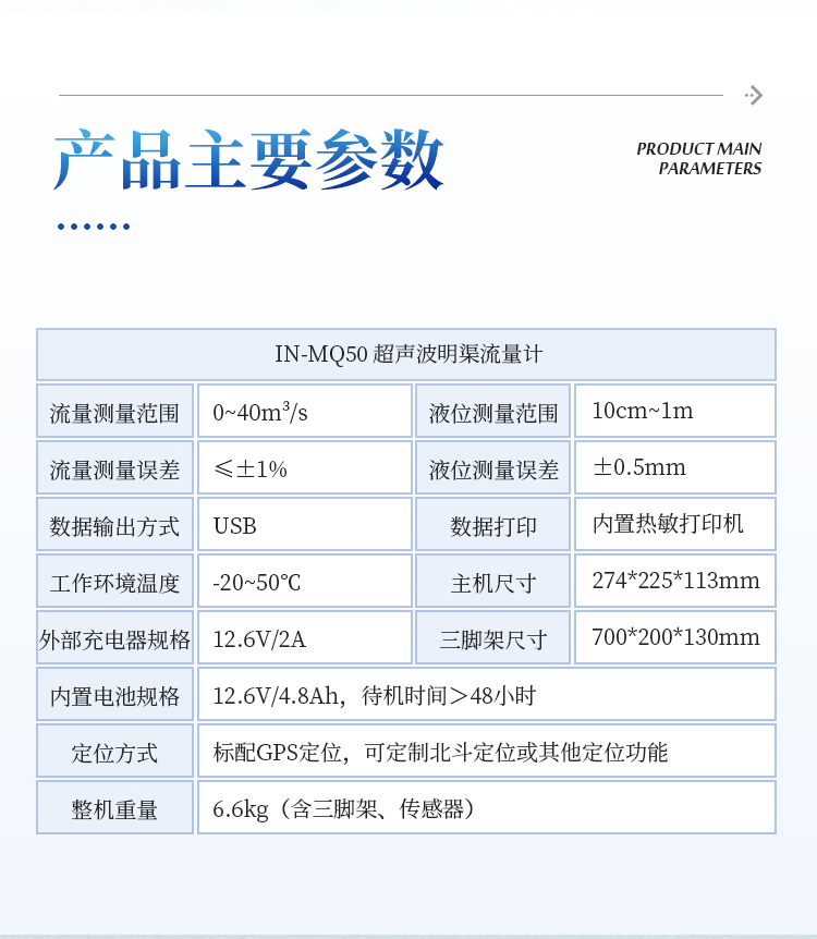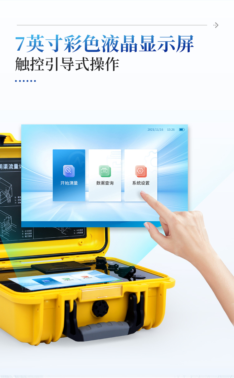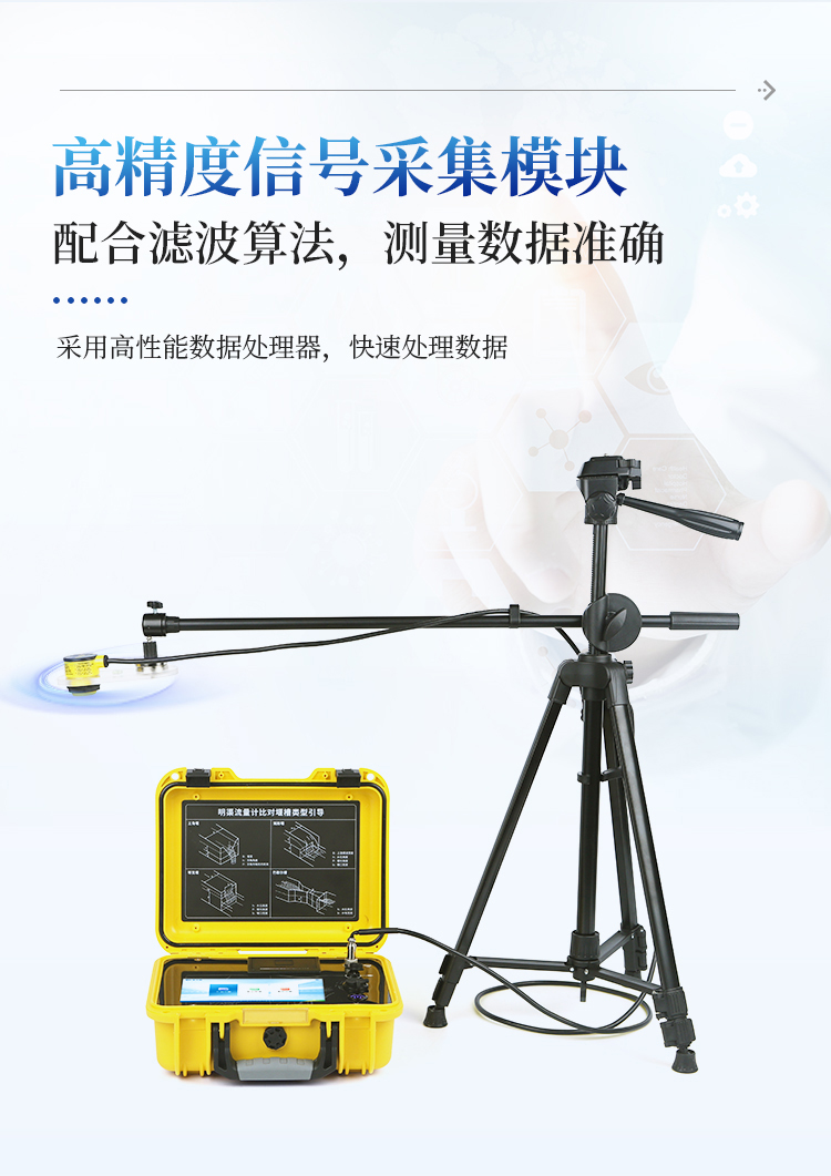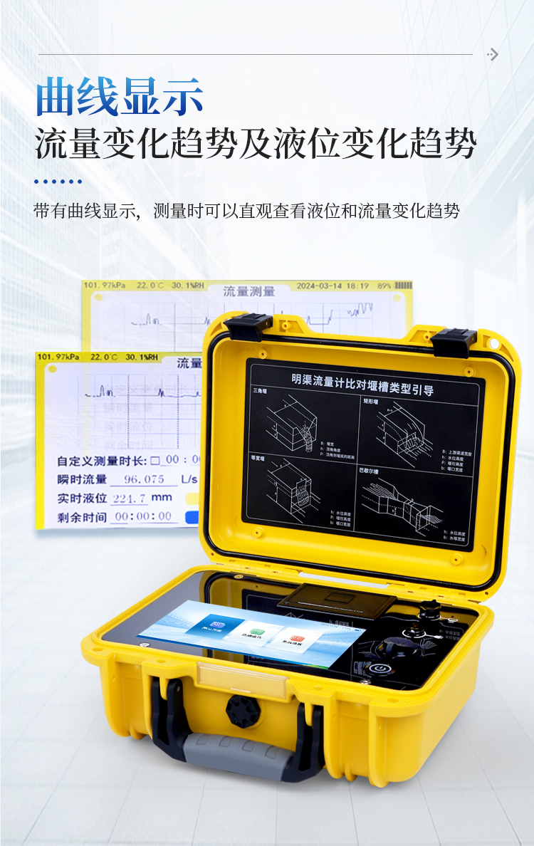 简要描述: 便携式明渠流量计是专为水文监测、江河流量监测、农业灌溉及市政给排水等行业设计的一种高精度测量仪表,它采用超声波技术和特殊的微功耗设计方案,结合全数字信号处理技术,确保了测量的稳定性与可靠性。该设备具有广泛的测量范围和较高的测量精度,支持实时数据显示、数据记录、导出及打印等功能,操作简便且准确度高,非常适合于需要频繁移动进行测量的场合。