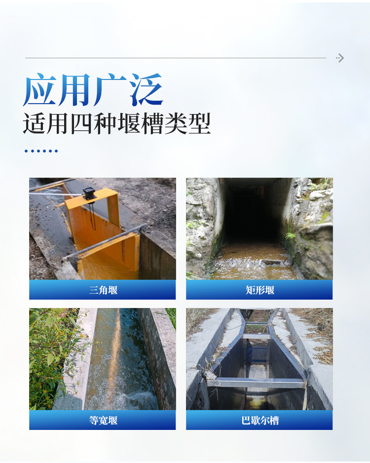 1、适用于三角堰、矩形堰、等宽堰和巴歇尔槽四种堰槽类型;