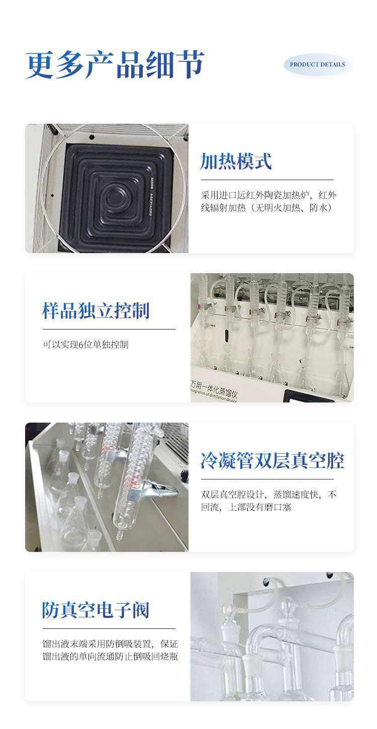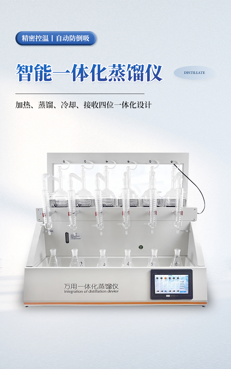 主要原理是根据药典中所提供的检测方法,将中药材以蒸馏法进行处理,样品中的亚硫酸盐系列物质加酸处理后转化为二氧化硫后,随氮气流带入到含有双氧水的吸收瓶中,双氧水将其氧化为硫酸根离子,采用酸碱滴定法测定,计算药材及饮片中的二氧化硫残留量。本产品在严格遵循药典要求的基础上,整合加热,蒸馏,水循环及氮吹等功能为一体,可同时提供3-6个样品(空白样,平行样)的处理,从而极大的提高了检测数据的精度和减少了工作时间。