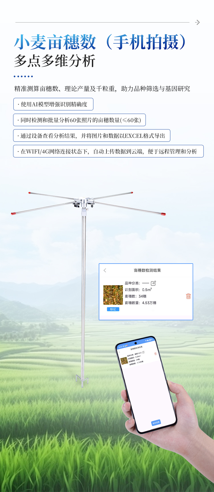 小麦亩穗数测量主要用于快速、准确地测量单位面积内的小麦穗数。该设备结合图像识别技术、人工智能算法与高分辨率摄像系统,通过对实地拍摄的小麦图像进行分析,自动识别并计数麦穗数量,极大地提高了测量效率与准确性。