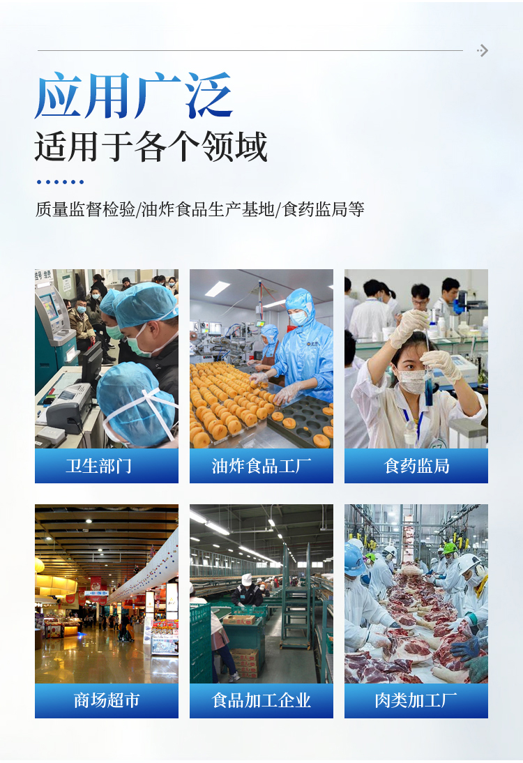 广泛应用于质量监督检验、工商管理、油炸食品生产基地、食药监局、卫生部门、肉制品食品深加工企业、农业部门、检验检疫部门、商场超市、各大食品安全监测系统等单位使用。