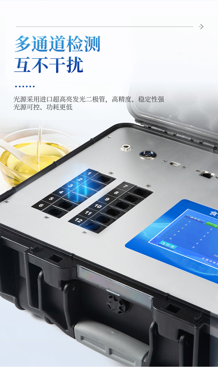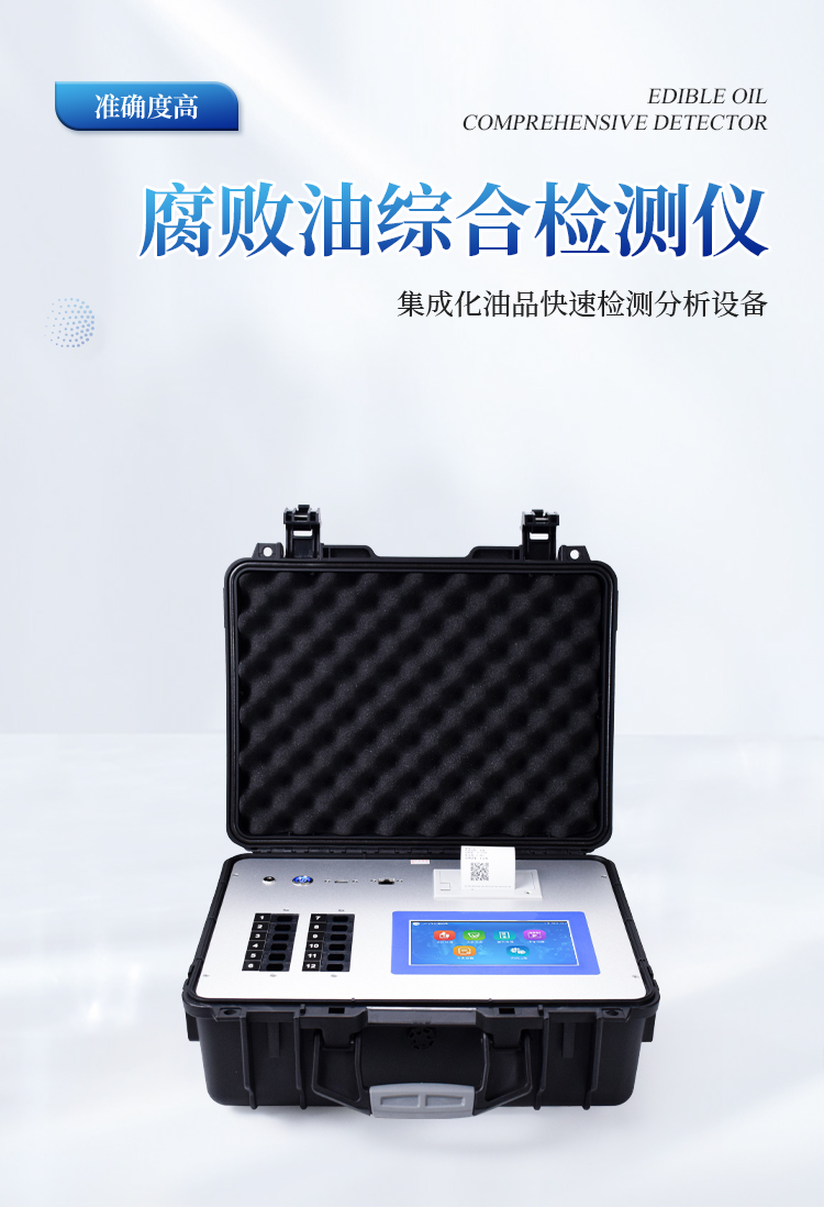 食用油综合检测检测仪为集成化油品快速检测分析设备,能够快速检测食用植物油、食用猪油、花生油、葵花油、米糠油、食品、肉制品中的酸价、过氧化值、黄曲霉毒素等含量;通过检测可确定植物油是否符合国家标准或是否为酸败油、劣质油、地沟油等。仪器预留其他项目检测程序和端口,根据日后需求可方便的自主增加检测项目。日后可升级为检测水产品、面制品的综合类型仪器。