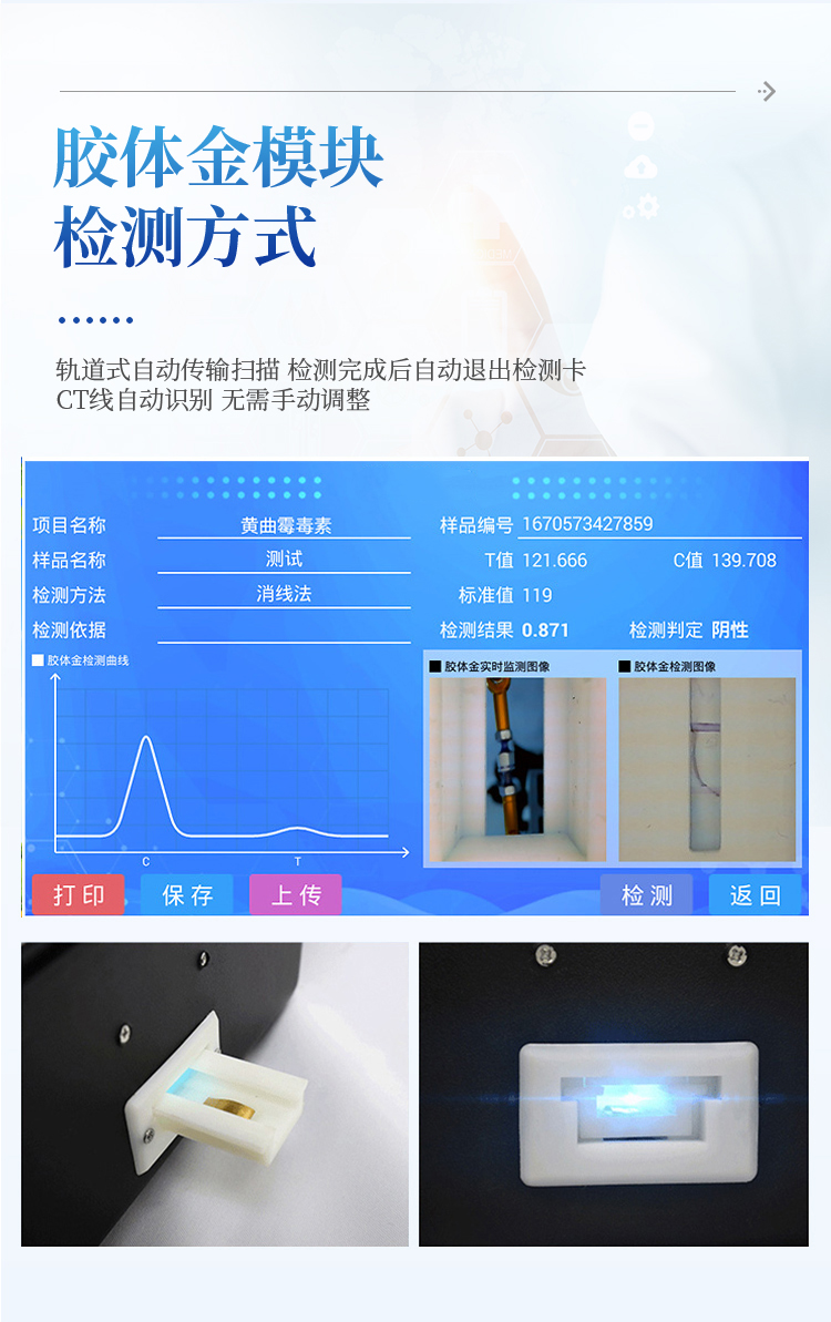 7、胶体金模块检测方式:轨道式自动传输扫描,检测完成后自动退出检测卡。