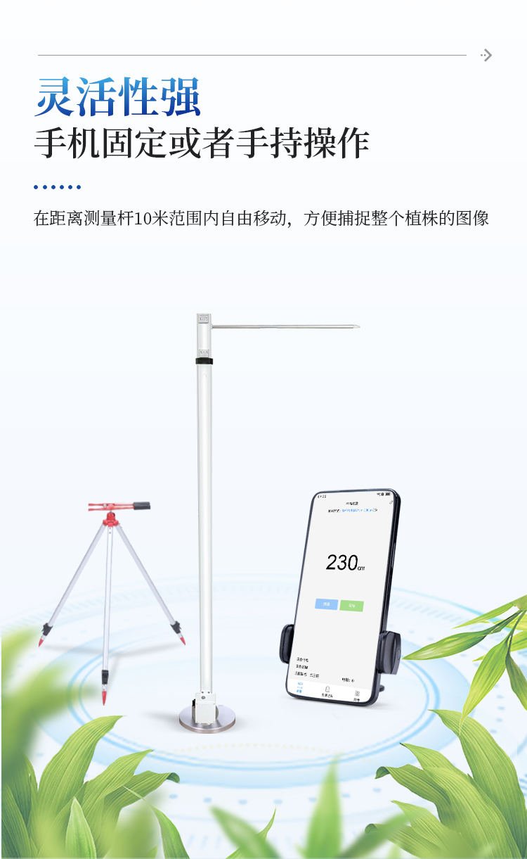 5、灵活性强 - 手机可以固定或者手持操作,测量过程中可在距离测量杆最远10米范围内自由移动,方便捕捉整个植株的图像。