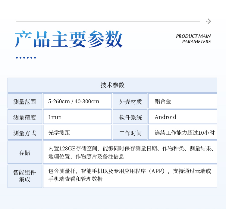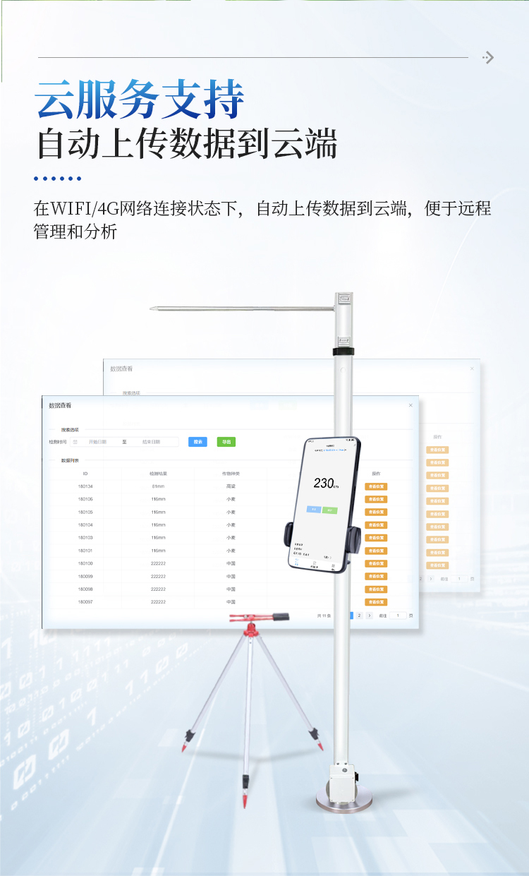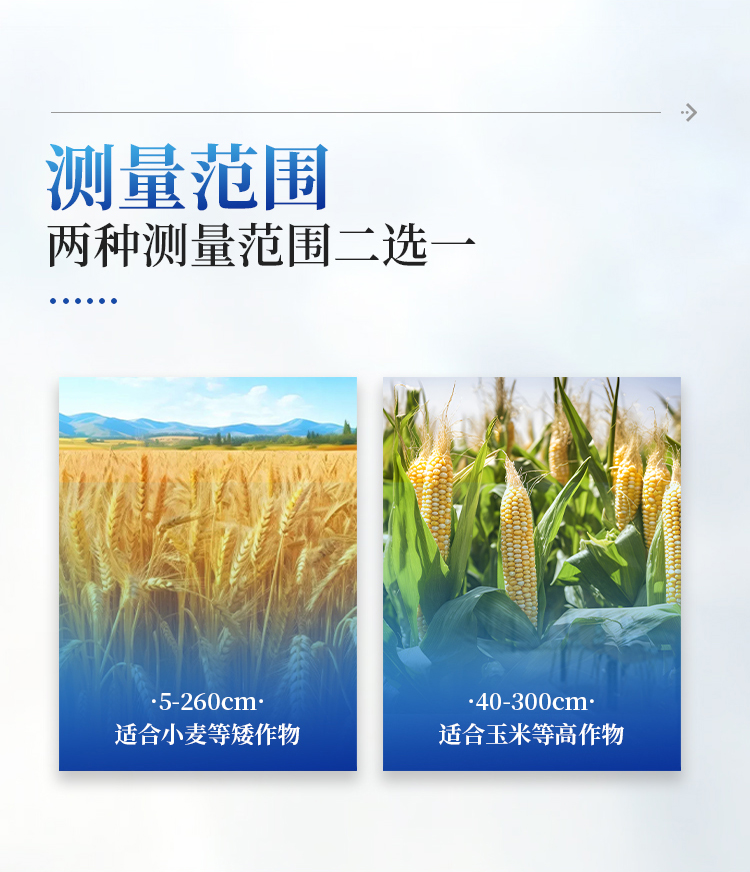 10、广泛应用性 - 最低测量高度0.05米,最大测量高度2.6米,适用于大多数类型的农作物株高测量需求。