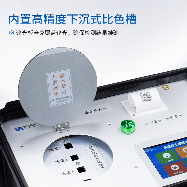 7.数据打印:内置热敏打印机(无需更换色带),可打印出检测项目、检测单位、检测人员、检测时间、通道号、吸光度、养分含量(mg/kg)、以及二维码等信息。
