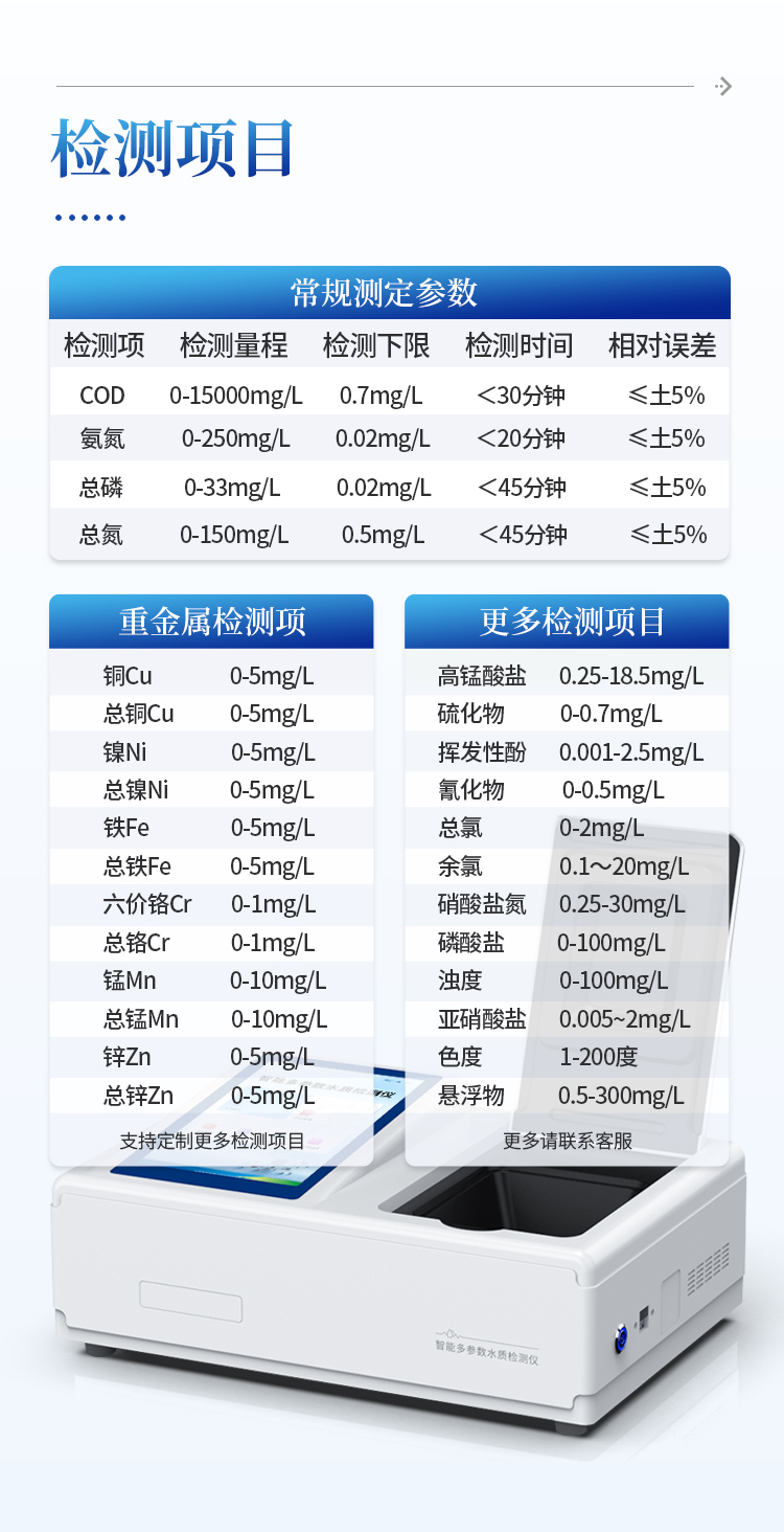 能够广泛的应用于各种行业(工业废水、城市污水、生活污水及江湖流域地表水)废水的检测,可适合不同用户的多种需求,可在化工、石油、焦化、造纸、冶金、酿造、医药等工业废水及各种生活污水监测应用。