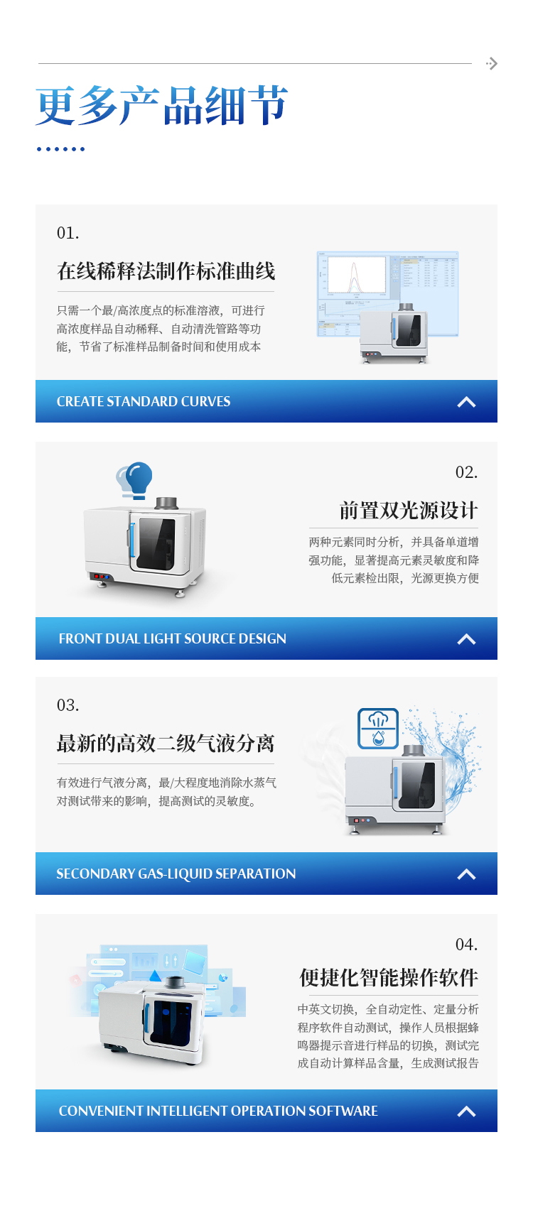 标准曲线的制作只需一个最高浓度点的标准溶液,仪器可进行高浓度样品自动稀释、自动清洗管路等功能,极大地节省了标准样品制备时间和使用成本。