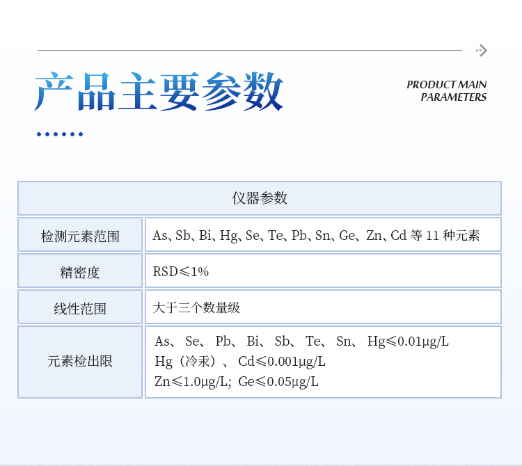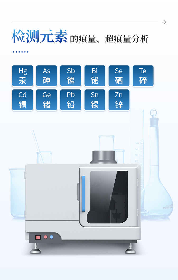 简要描述: 双道原子荧光光谱仪主要测试样品中 11 种超痕量元素的含量,最低检测下限可达千亿分之一级。应用领域包括水质、土壤、大气等样环境检测项目、食品检验、检验检疫、药品检验、化妆品检验、土壤饲料肥料检验、地质矿产测试、冶金样品检验、教学研究等。