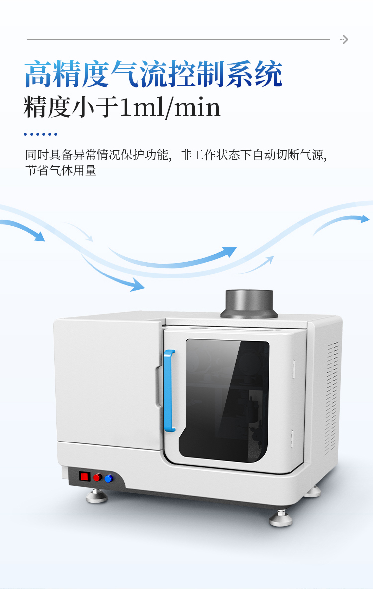 仪器采用高精度质量流量控制器进行气体流量控制,精度小于 1ml/min。同时具备异常情况保护功能,仪器非工作状态下自动切断气源,节省气体用量。