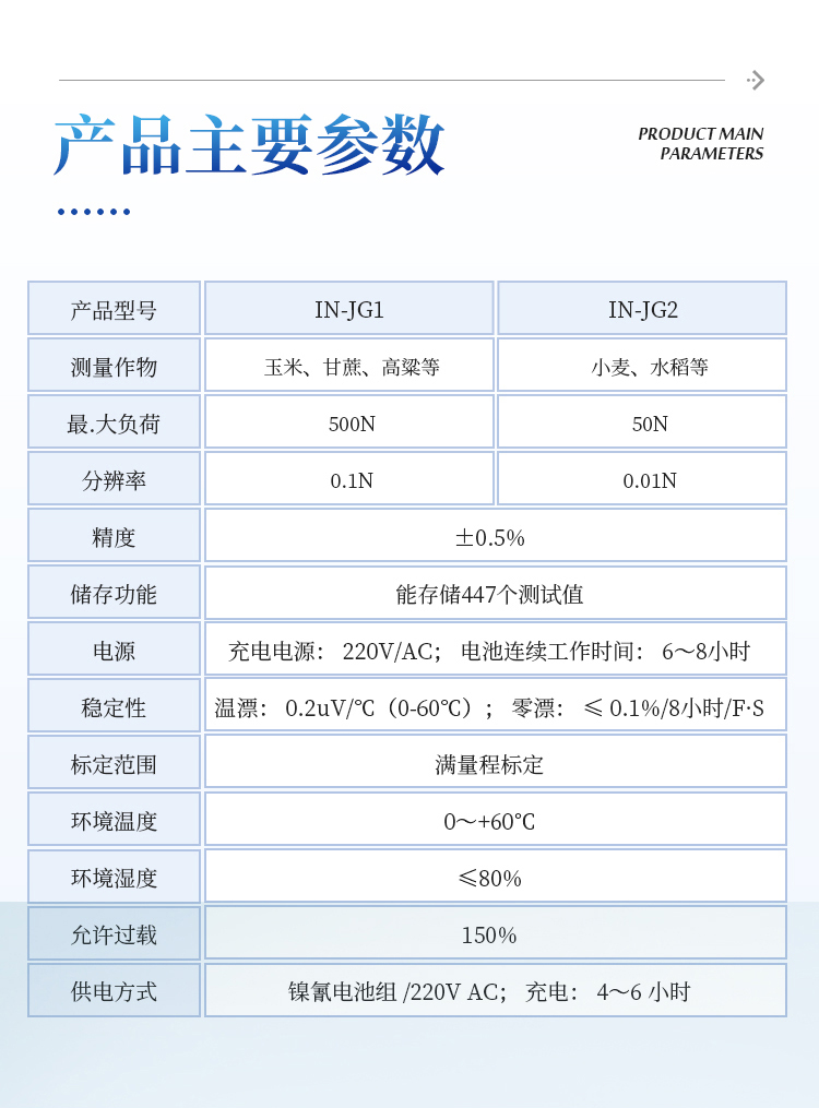 植物茎秆的强度是决定作物抗倒伏能力的一个主要因素,长期以来玉米,高梁、烟草等的倒伏给作物的机械收割造成很大的困难。从机械化水平来说,造成大量的粮食浪费。另外,作物倒伏导致光照不充分,使其生产量受到极大的限制。在作物生长的各个阶段对其茎秆进行活体测量,进而根据茎杆纤维层的抗弯阻力与抗倒伏能力的相关性对群体测量数据进行统计处理,对作物的栽培和育种具有重要意义。植物茎秆强度仪采用拉压力传感器,通过针刺、压碎、折断的方式测出茎秆断裂或者屈服瞬间产生的最大力,即茎秆的强度。