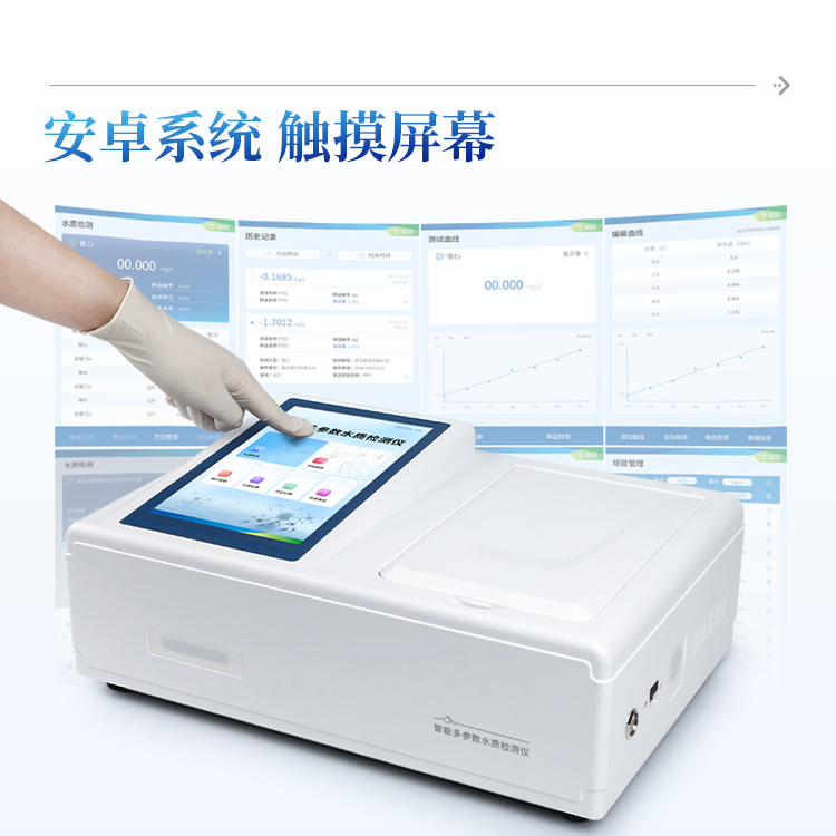 水质四氮检测仪是参考相关标准研发设计制造,本仪器主要检测水质氨氮、硝酸盐氮、亚硝酸盐氮、总氮浓度指标,兼具智能数据分析功能,图表、列表显示数据,分析一目了然;高清晰度彩色液晶触摸显示屏,androids智能操作系统,中文显示界面,中英文键盘,人性化操作,使用更简单。