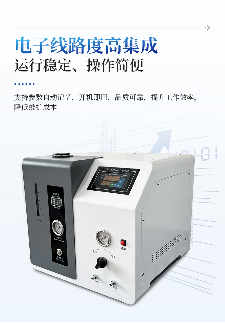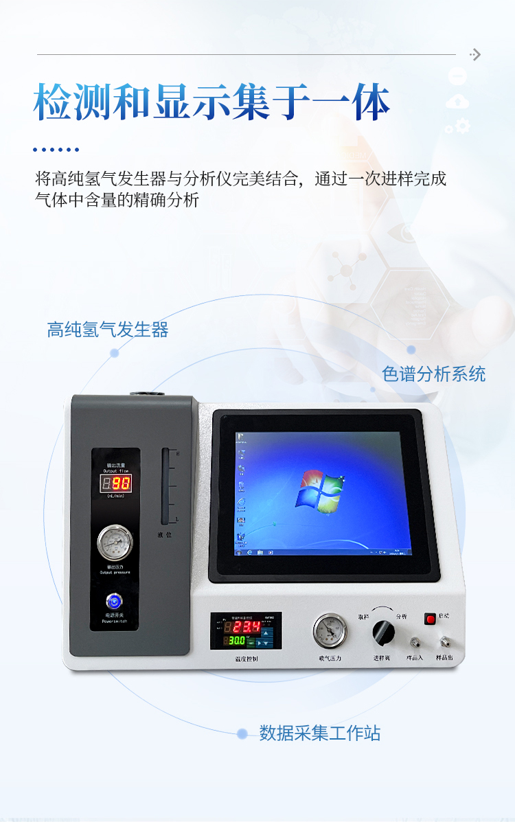 1、将高纯氢气发生器 ,工业级电脑、分析仪、色谱工作站完美结合,检测和显示于一体,通过一次进样可以完成气体中含量的精确分析,可直接打印分析报告,只需一台仪器就可完成整个分析,检测过程更简单化。