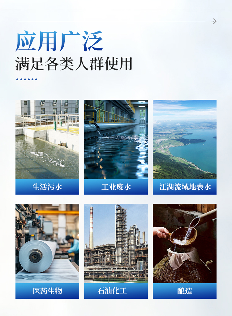 能够广泛的应用于各种行业(工业废水、城市污水、生活污水及江湖流域地表水)废水的检测,可适合不同用户的多种需求,可在化工、石油、焦化、造纸、冶金、酿造、医药等工业废水及各种生活污水监测应用。