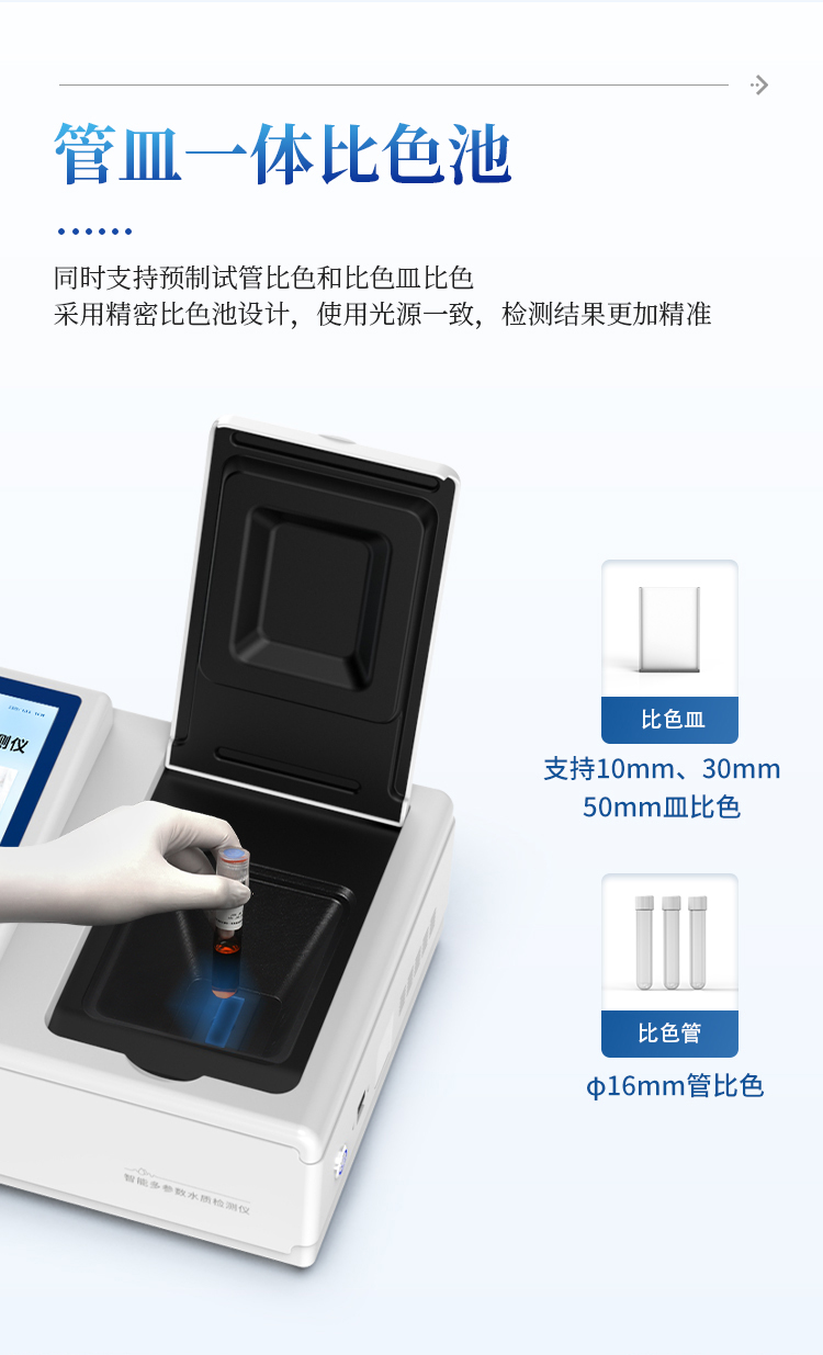 5、支持10mm、30mm、50mm皿比色和φ16mm管比色等比色方式,多元选择,确保测量的准确性;