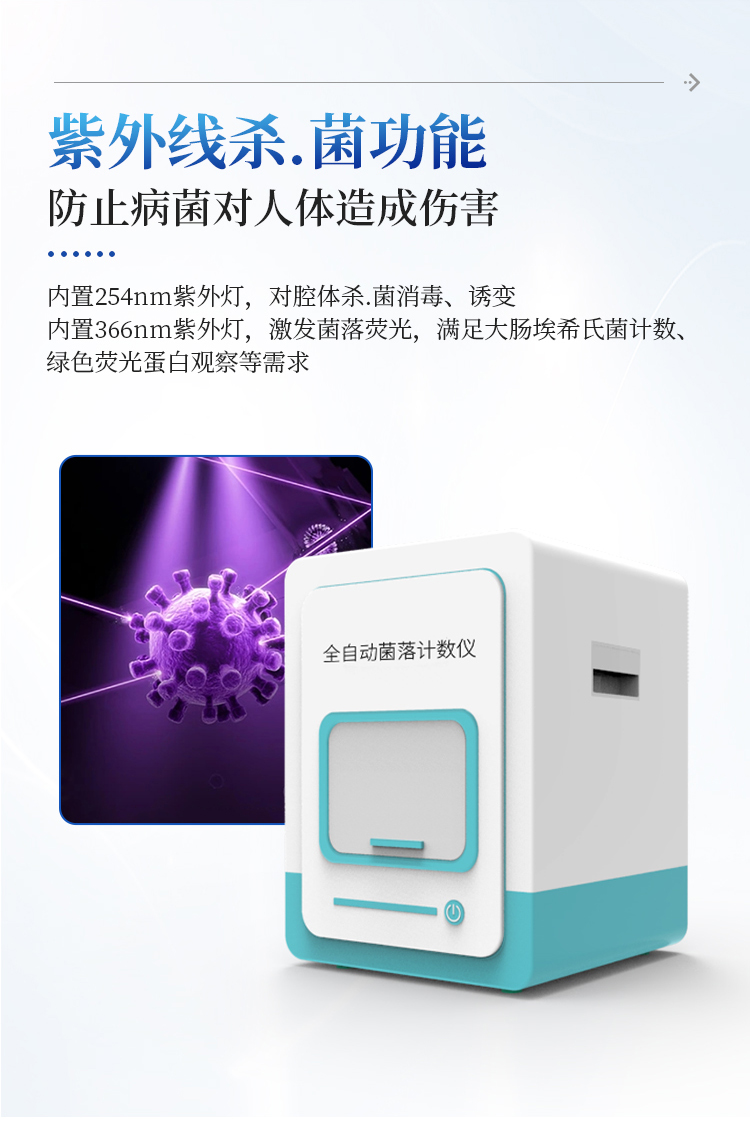 内置366nm紫外灯,可激发菌落荧光,满足大肠埃希氏菌计数、绿色荧光蛋白观察等需求
