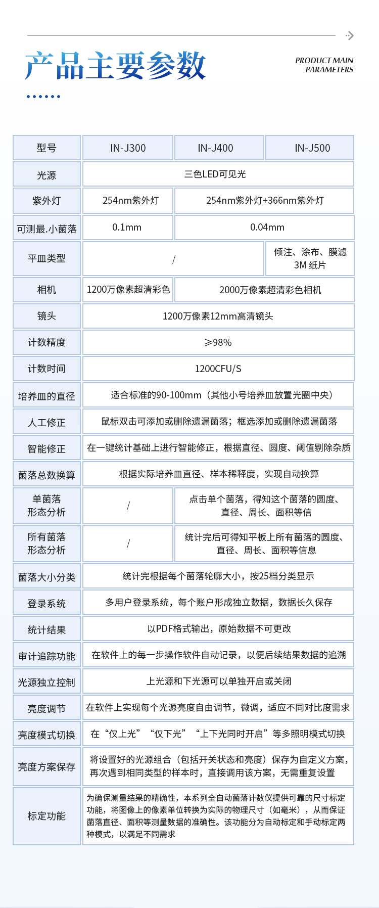 本产品是一款集图像采集、数据处理与统计于一体的自动菌落计数,广泛应用于食品、药品、化妆品、环境监测、医疗卫生、科研院校等领域的菌落计数。该仪器采用先进的数字图像处理技术,具备荧光菌识别和杀菌功能,可实现对培养皿中菌落的快速、准确、全自动计数,显著提升实验效率,降低人工误差。