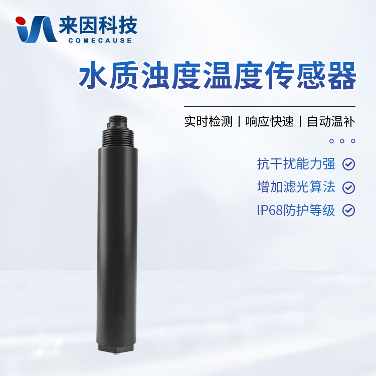 简要描述: 在线浊度水温传感器通过测量光的散射来判断液体中颗粒的浓度。它使用一个光源照射到液体中,然后测量光在不同角度上的散射光强度。本传感器采用90°角散射光法,线性处理采集值,并经过温度补偿算法,输出浊度值。传感器安装时不能倒置或者水平安装,至少倾斜15度角以上安装。测试口左右5CM之内不会碰到容器壁,下方10CM.