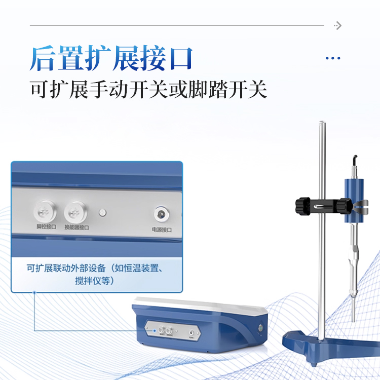 14. 后置扩展接口,可扩展手动开关或脚踏开关,实现手动精细控制,也可扩展联动外部设备(如恒温装置、搅拌仪等)可选配连接上位机。