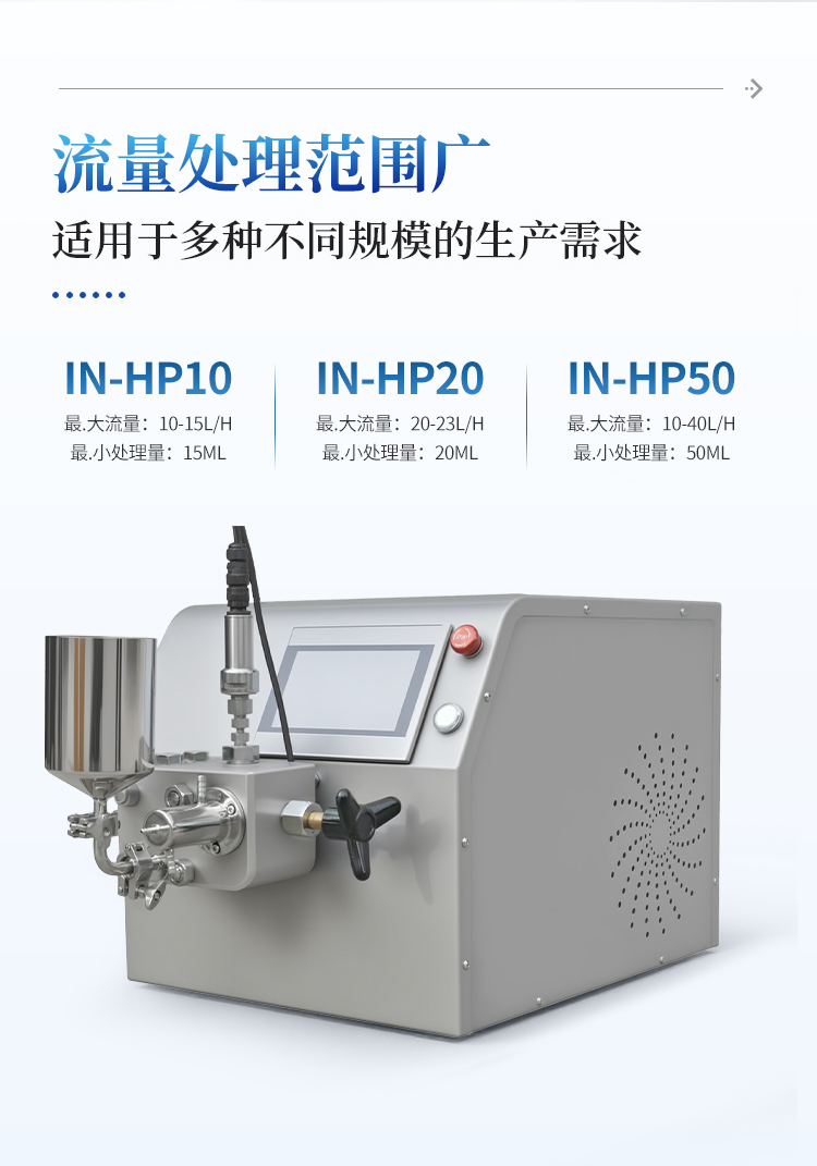 1、广泛适用性:能够处理流量在20-23L/H的产品,同时最小处理量低至20ML,适用于多种不同规模的生产需求。