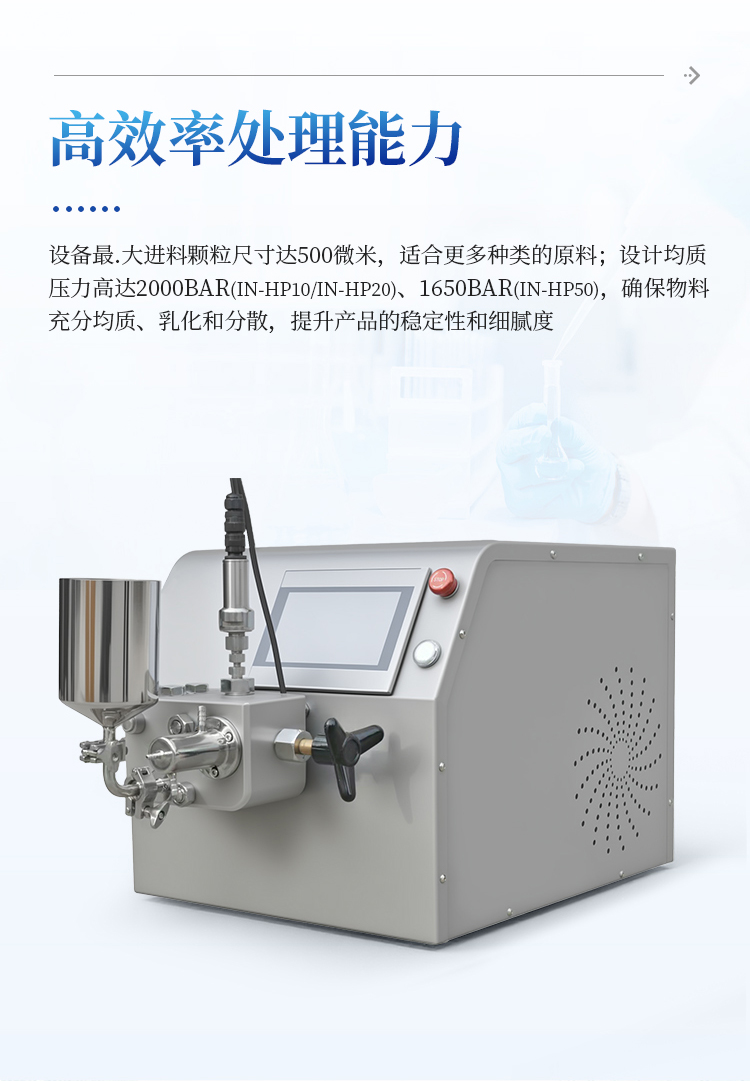 2、高效率处理能力:设备最大进料颗粒尺寸可达500微米,适合更多种类的原料;设计均质压力高达2000bar,确保物料充分均质、乳化和分散,提升产品的稳定性和细腻度。