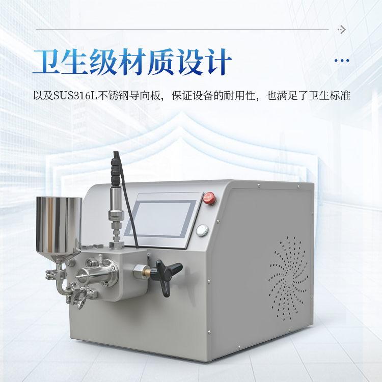 3、卫生级设计:采用氧化锆陶瓷柱塞和金刚石均质阀,以及SUS316L不锈钢导向板,不仅保证了设备的耐用性,也满足了卫生标准,特别适用于制药、化妆品等行业。