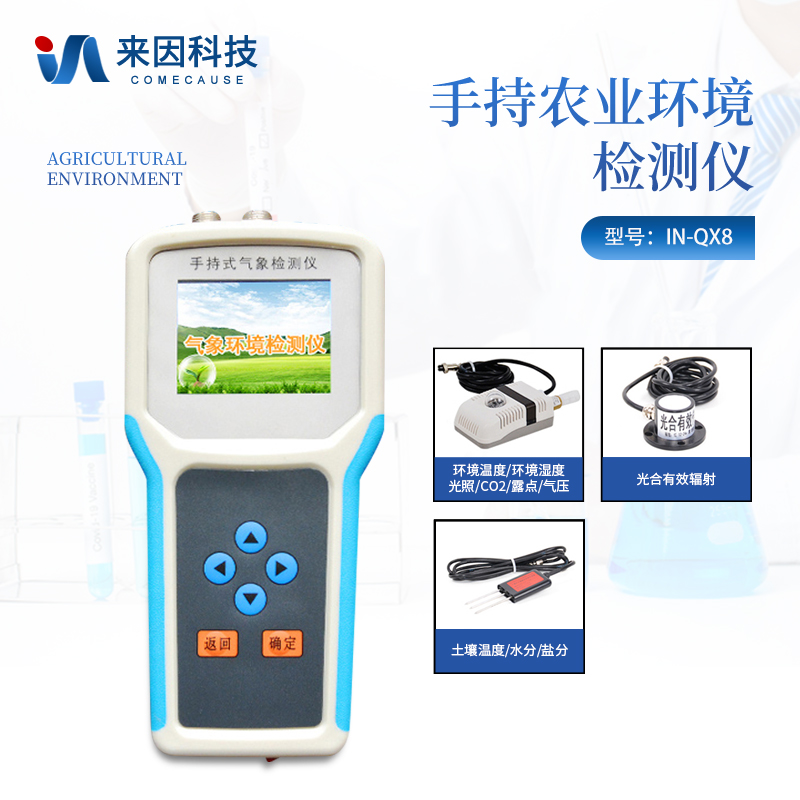 简要描述: 手持式智能农业气象环境检测仪IN-QX8是榴莲视频在线观看污专门针对农田、草场局部小尺度环境设计的,对与植被和农作物生长密切相关的土壤、水气等环境参数监测的农田小气候站。它主要观测与农业相关的空气温度、空气湿度、光照强度、二氧化碳浓度、露点温度、光合有效辐射、土壤温度、土壤湿度等8个环境参数气象要素,为农业科研、农业生产等提供良好的支持。