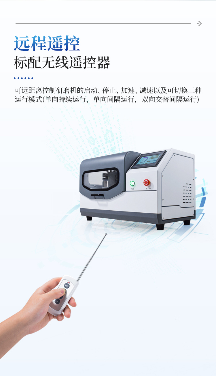 远程遥控:标配无线遥控器,可远距离控制研磨机的启动、停止、加速、减速以及可切换三种运行模式(单向持续运行,单向间隔运行,双向交替间隔运行)