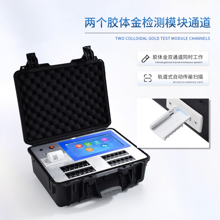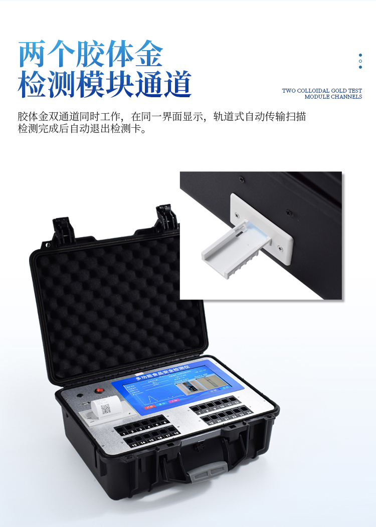 3、★两个胶体金检测模块通道,胶体金双通道可同时工作,在同一界面显示,轨道式自动传输扫描,检测完成后自动退出检测卡。