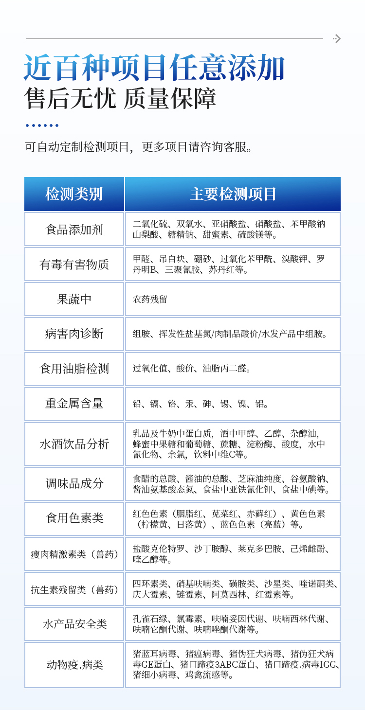 该多功能食品安全检测仪为集成化食品安全快速检测分析设备,广泛应用于市场监管局、检测中心、卫生监督部门、农业部门、院校及各单位食堂、食品肉产品深加工企业、商超市场、司法部门、餐饮机构、养殖场、屠宰场、检验检疫部门等单位使用。
