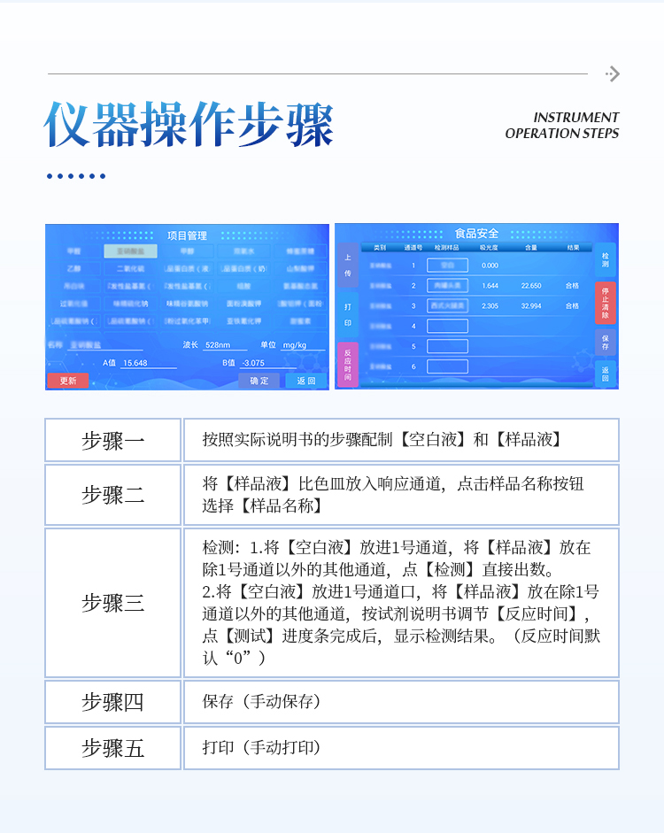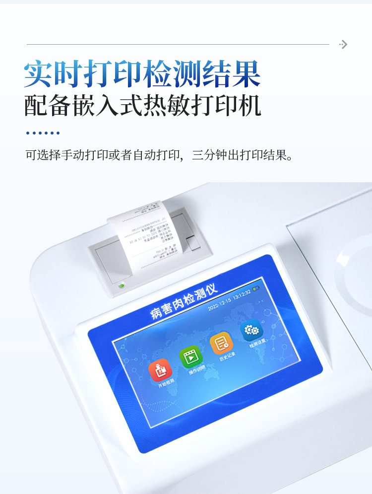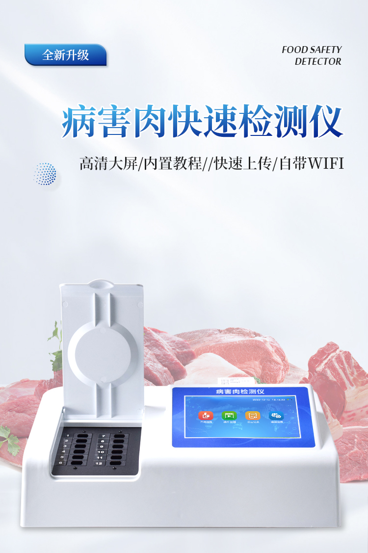 可快速检测病害肉、组胺、挥发性盐基氮,仪器预留其他项目检测程序和端口,根据日后需求可方便的自主增加检测项目。