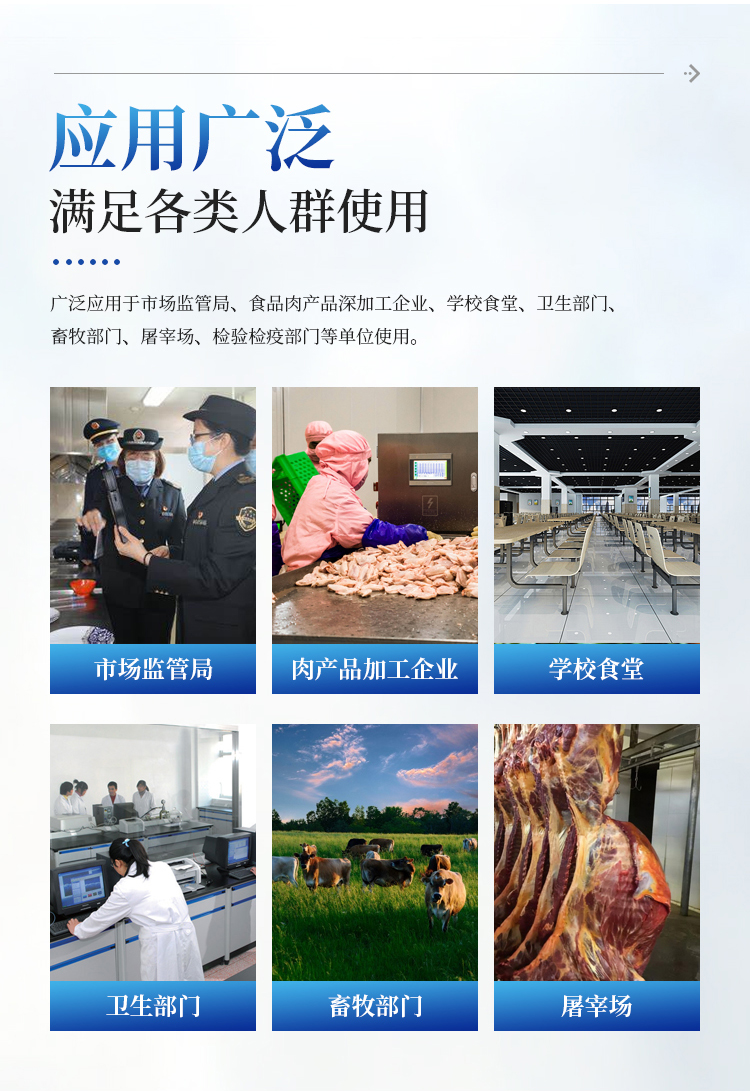 该多功能食品安全检测仪为集成一体化食品安全快速检测分析设备,广泛应用于市场监管局、食品肉产品深加工企业、学校食堂、卫生部门、畜牧部门、屠宰场、检验检疫部门等单位使用。