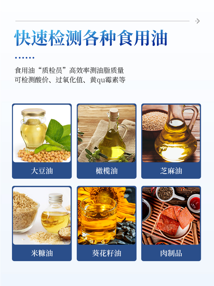 食用油综合检测检测仪为集成化油品快速检测分析设备,能够快速检测食用植物油、食用猪油、花生油、葵花油、米糠油、食品、肉制品中的酸价、过氧化值、黄曲霉毒素等含量;通过检测可确定植物油是否符合国家标准或是否为酸败油、劣质油、地沟油等。仪器预留其他项目检测程序和端口,根据日后需求可方便的自主增加检测项目。日后可升级为检测水产品、面制品的综合类型仪器。