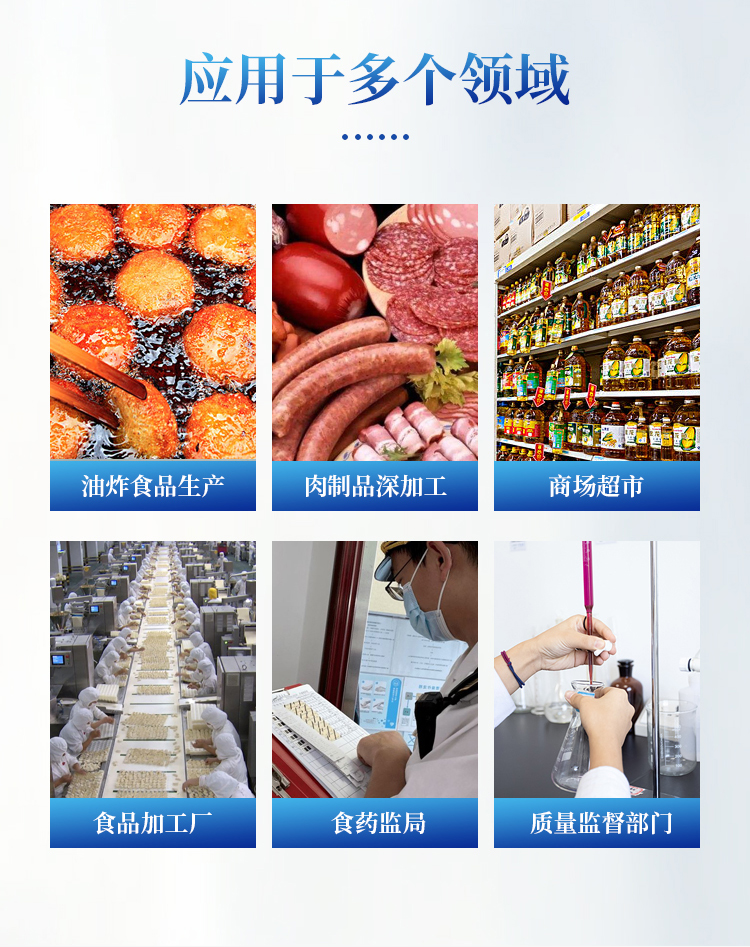 广泛应用于质量监督检验、工商管理、油炸食品生产基地、食药监局、卫生部门、肉制品食品深加工企业、商场超市、各大食品安全监测系统等单位使用。