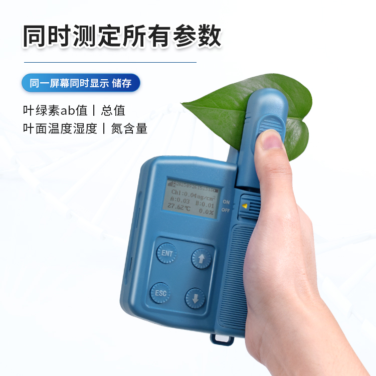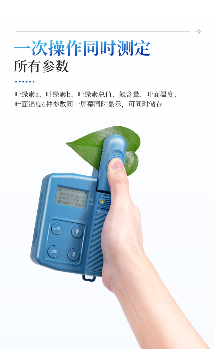3.一次操作可同时测定所有参数,叶绿素a、叶绿素b、叶绿素总值、氮含量、叶面温度、叶面湿度6种参数同一屏幕同时显示,且可同时储存