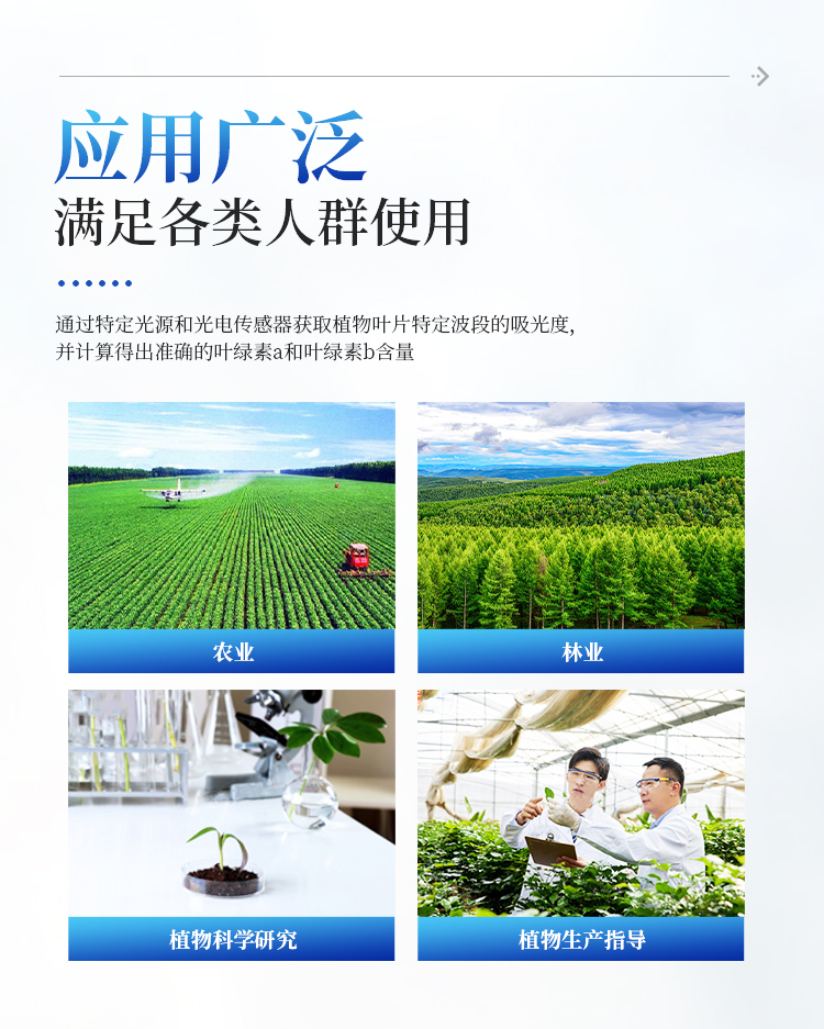 叶绿素a、b检测仪是一种通过特定光源和光电传感器获取植物叶片特定波段的吸光度,并计算得出准确的叶绿素a和叶绿素b含量的无损检测设备。它具备便携轻便的特点,可在野外对非离体的植物叶片进行定量检测,用于帮助判断植物生理生态的异常情况。这款仪器提供真实的叶绿素a和叶绿素b含量数值,而非SPAD值。