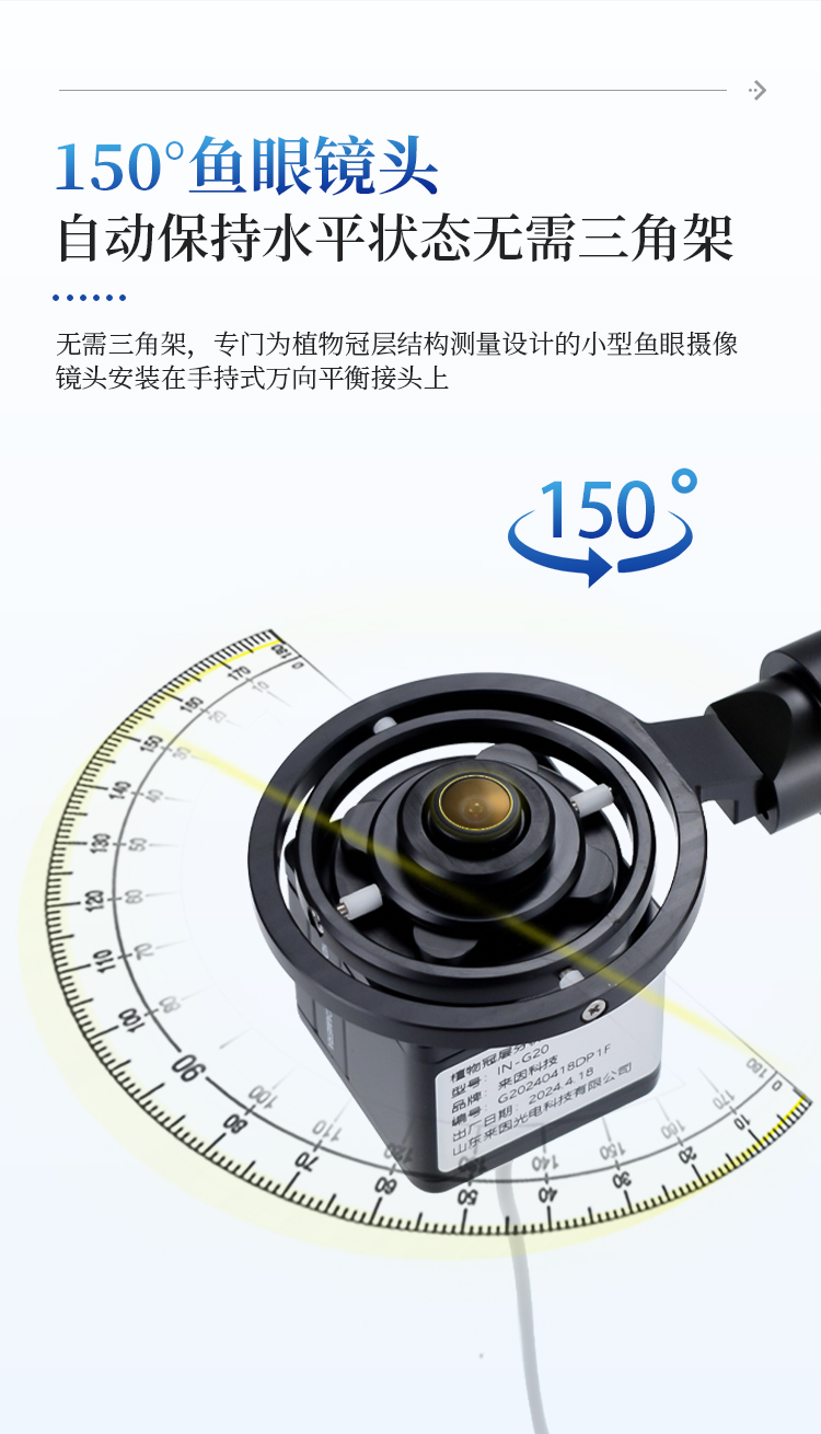 鱼眼镜头可自动保持水平状态:专门为植物冠层结构测量设计的小型鱼眼摄像镜头安装在手持式万向平衡接头上,可自动保持镜头处于水平状态,无需三角架;