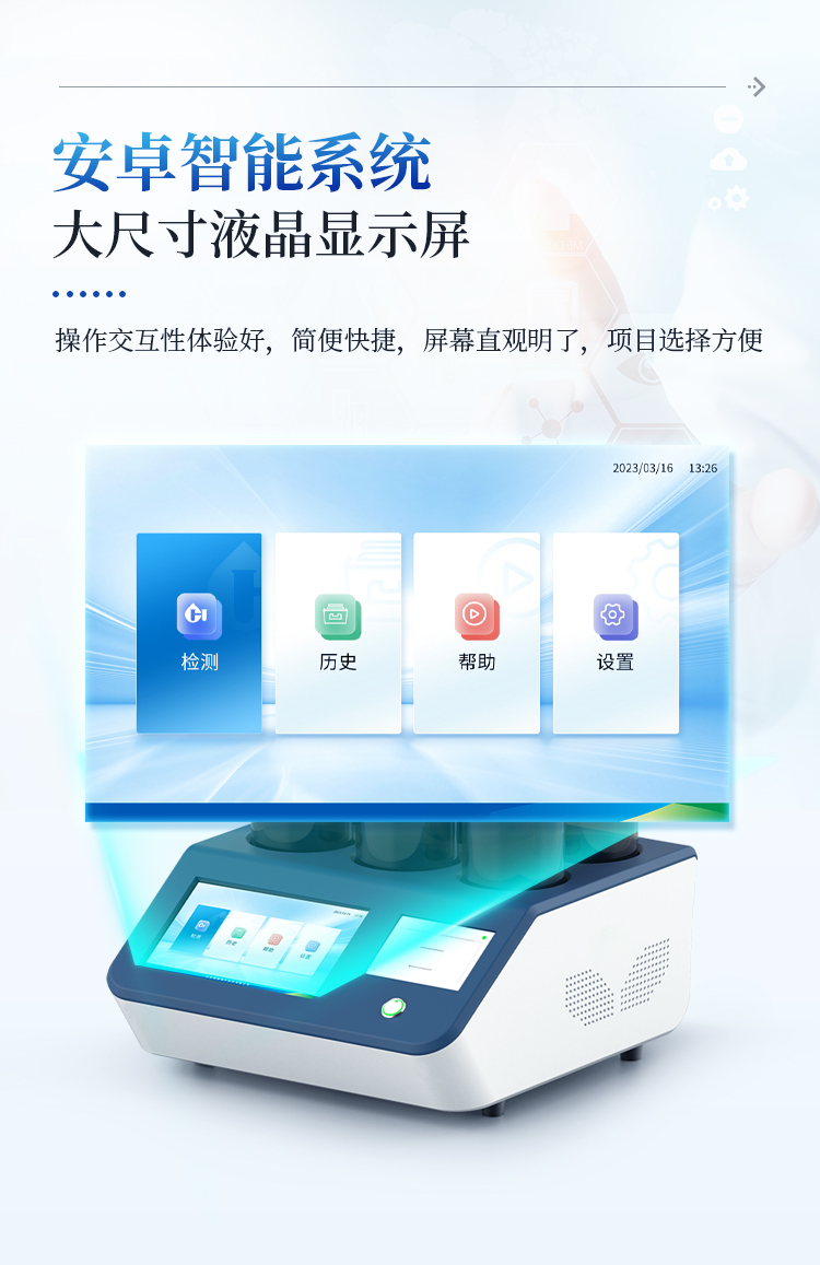 简要描述: BOD快速测定仪采用国际先进的无汞压差法,无汞污染,且数据准确可靠;6个测试终端,独立控制,在检测过程中可随时加入新的测量组;androids智能系统,操作交互性体验更好,更加简便快捷;7英寸液晶触摸屏,人性化设计的人机交互,所有数值对比显示,简单直观;无需人工换算,仪器可直接显示BOD浓度值,多组数据可在统一界面显示。