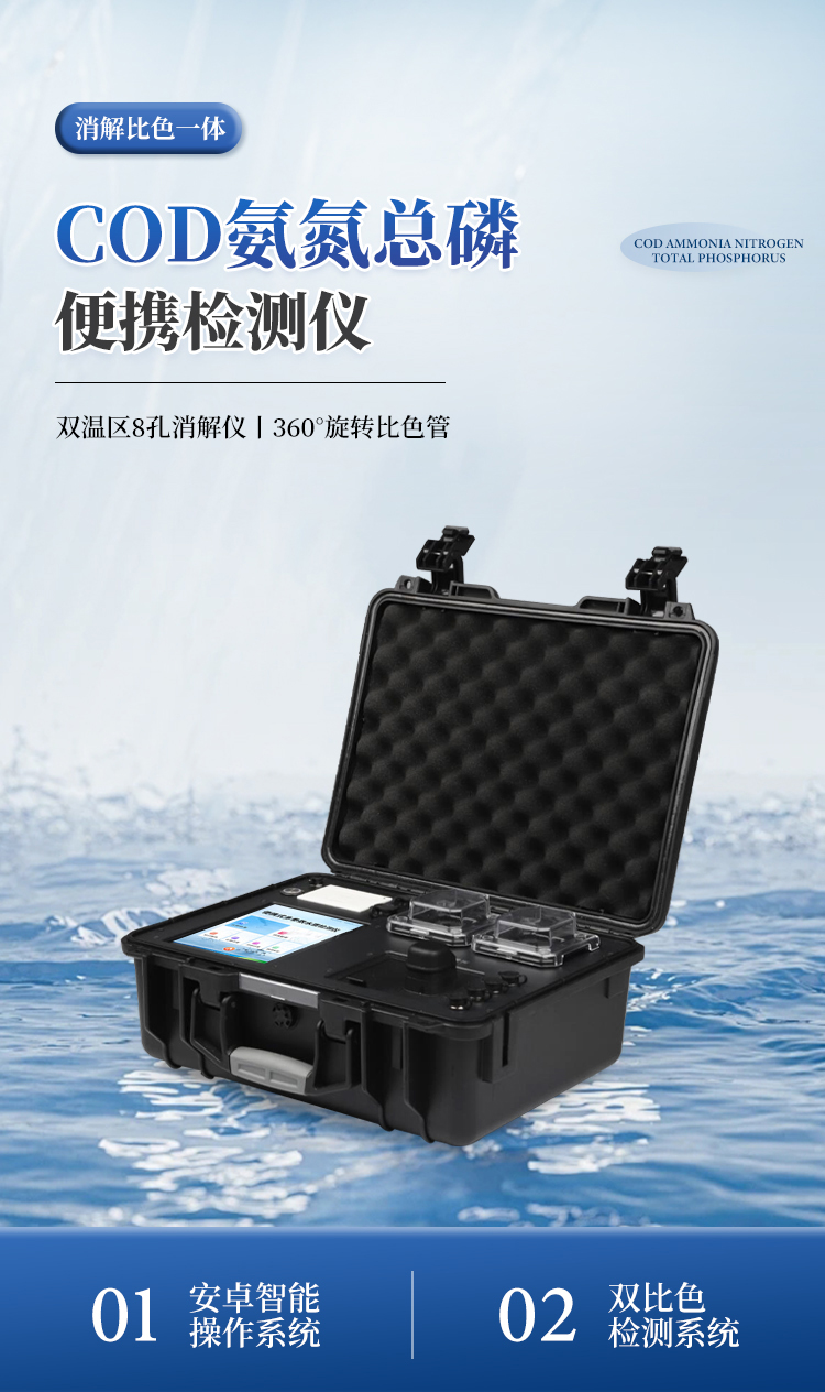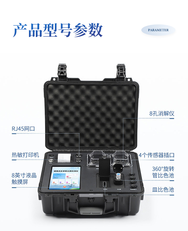 便携一体式多参数水质检测仪集成两种快速检测原理方法(分光法和电极法),采用高强度PVC工程塑料手提箱设计,消解检测一体式设计,其中消解模块具备双温区功能,检测部分同时具备360°旋转比色管检测和比色皿检测,安卓智能操作系统,8英寸高清液晶触摸屏,光纤检测技术,进口光源,内置大容量锂电池,便携多参数水质检测仪具有性能稳定、测量准确、测定范围广、功能强大、操作简单等特点。